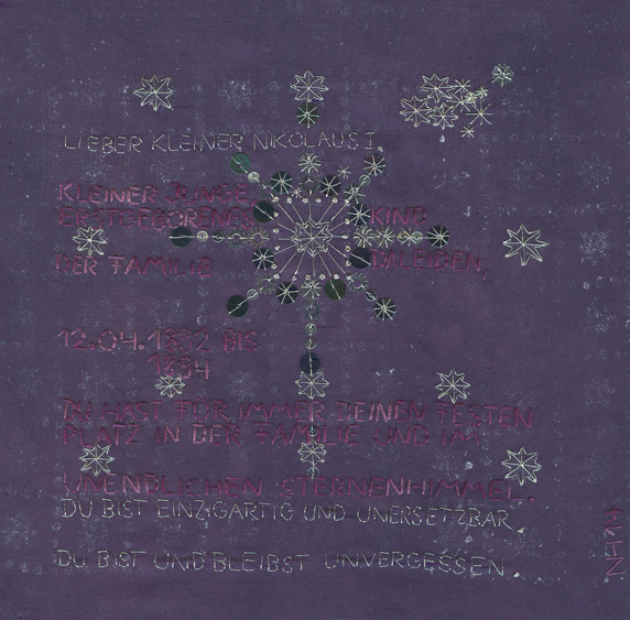 "Kleiner Nikolaus I." (2014), Stickerei mit Seide, Silberfaden und Pailletten auf gefärbter und bedruckter Baumwolle, 20 x 20 cm