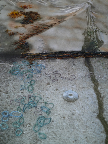 Detail aus "Ich bin überall wo Du bist" (2012) - Freie Metall- und Seidenstickerei, 45 x 42 cm