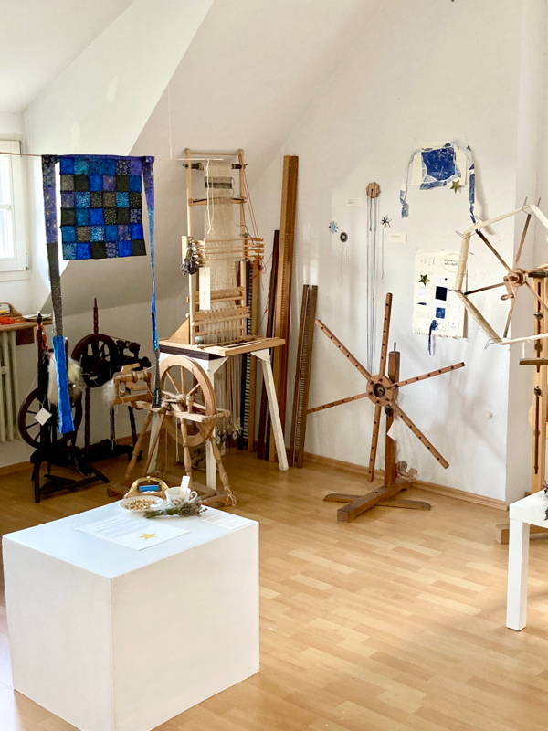 "Sternenschürzchen", Baumwolle, handgenäht in Patchworktechnik; hier in der Ausstellung "Geheime Werkstatt" im Handwebmuseum Rupperath, Bad Münstereifel (2024)