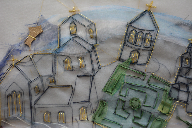 "Die friedlichen Häuser"; Freie Stickerei, Färbetechnik; Seide, Leinen, Papier, versilberter Metallfaden; 22 x 20 cm