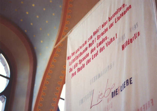 „Hölderlinfahne“ - Druck und Stickerei auf Baumwolle, 110 x 270 cm