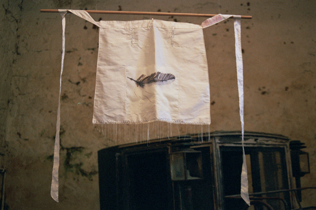 Detail aus "Morgenstern der finstern Nacht"; Kleine Fahne aus pflanzengefärbtem Abacapapier und Seide; Freie Handstickerei und Appliqué