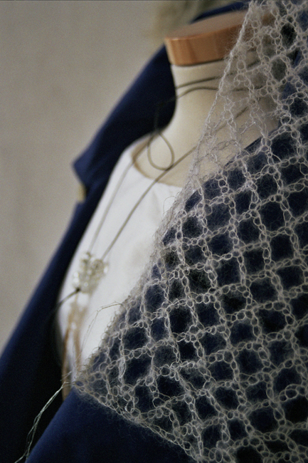 „Mantel der Nacht“, „Federkleid“, „Windsbraut“ - „Mantel der Nacht“ und „Federkleid“ aus genähter und bestickter Seide, "Windsbraut" aus gehäkeltem Mohair mit Seide